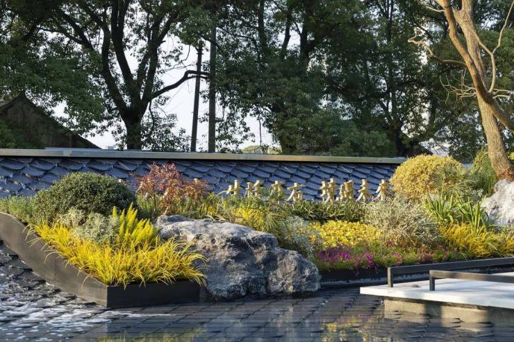 入口两侧采用镜面跌水式水景与中式鱼鳞水景将有限延伸为无限,流水潺潺,熠熠水光,镜面水景的 光影效果配合凹凸线条的层次变化, 错落的花镜倒映在水面上,营造大气开阔的氛围。