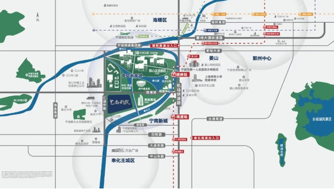 景观设计:项目南向一线临奉化江,与大欧河、东面河流形成三江交汇的静谧水岸,推窗即可瞰江揽胜,坐拥城市稀缺江景资源。步行约 600 米可达约 4.4 万方奉心湖、滨江体育公园及中央公园,将自然诗意与城市繁华完美融合。