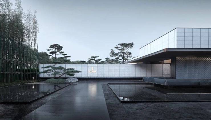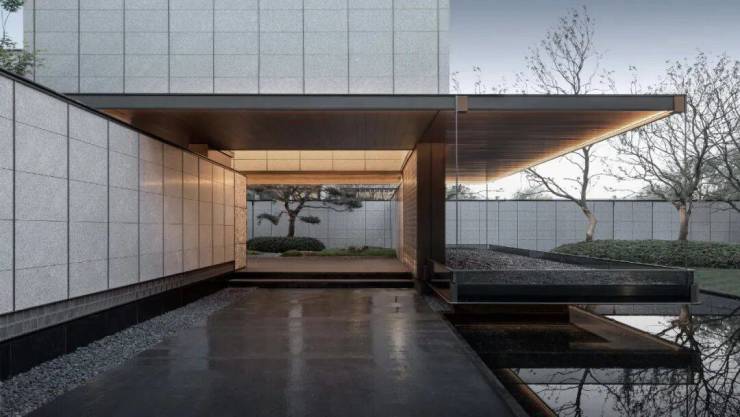 艺廊主入口蟒水纹叠构的片墙架起单片挑檐,使形体产生强烈的悬浮感。摒弃多余的装饰,在建筑材料颜色、质感与纹路上精心择选,是空间本身的同时,也形成了具有引导性的艺术装置。主体建筑“巧藏”于艺廊之后,若有光线,具体形态不入不得而知。