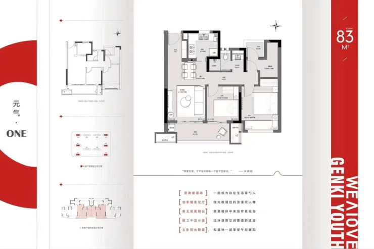 83㎡的户型呈动静分离格局,双阳台连接客厅和南次卧,卫生间做了干湿分离,北面小房间需要后期改造,主卧带飘窗,是一个非常经济实用的小面积户型。