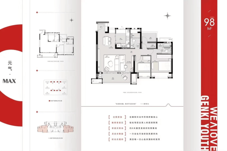 最大户型98㎡做了横厅设计,客厅开间5.9米。南北两面均带有飘窗,赠送面积较多。