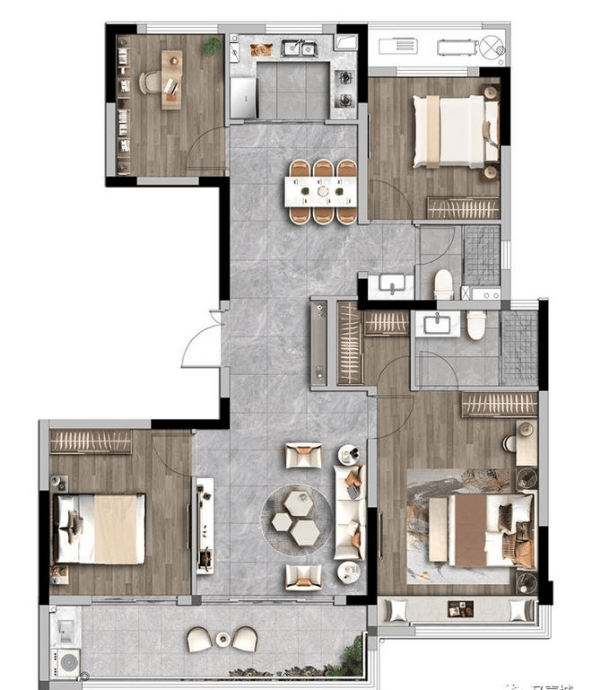 建面约130㎡的户型,设计成户型中利用率比较高的四叶草格局,主动线位于住宅中央,四个房间位于住宅四角,相互独立不干扰。