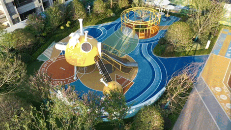 较大程度地开发利用每一处可创造欢乐的角落,地面铺装采用活力蓝色和元气橙色的色系组合设计场地,赋予场地无限的幻想。利用直线、圆环进行视线的拉伸和收缩,巧妙地运用空间布局和多彩的环境变化,使整个空间层次错落有序。