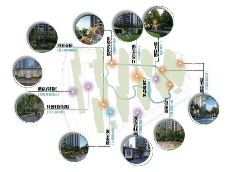 儿童活动空间针对不同年龄段设立了不同的主题模块,打造适龄、有趣、充满创意的儿童活动场地,伴随各年龄段儿童快乐成长,休闲看护亭的设立不仅保证了孩子们的安全,还为家庭成员互相陪伴共享天伦提供了条件。