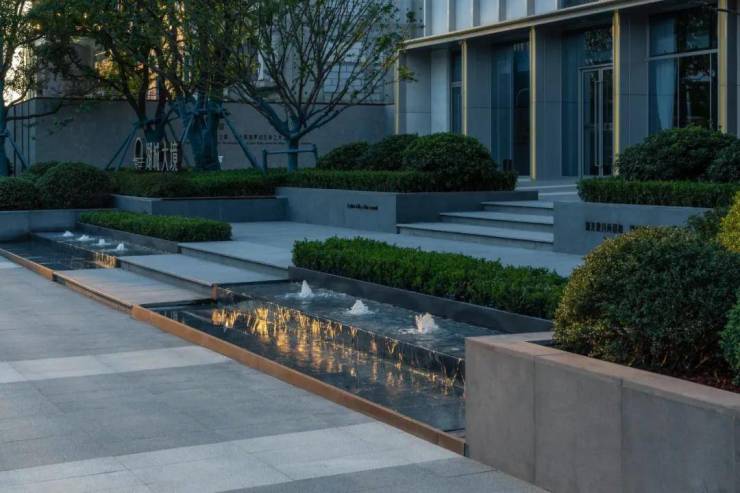 层层水景与种植池以直线形式相互结合,现代简约的质感于各中体现。阳光透过树梢洒在景墙之上,树影随风摇曳,为空间平添几分朦胧之美。