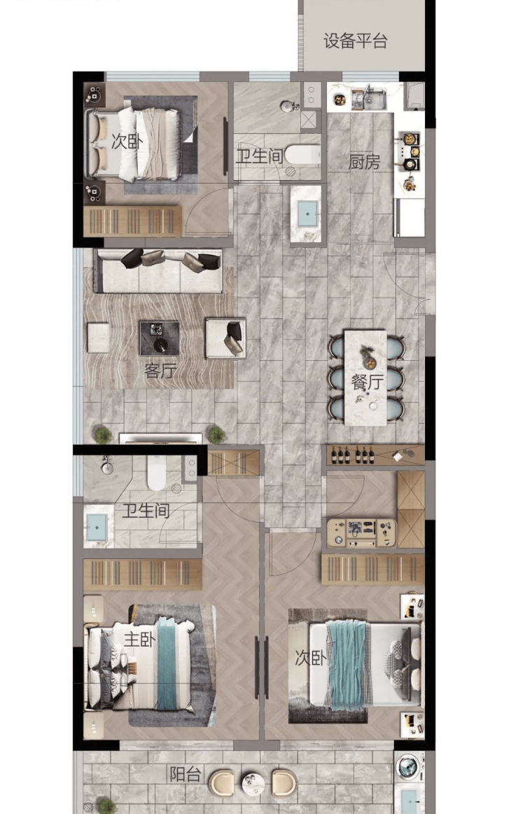南向依次铺陈开了主卧+2次卧+大横厅,采光与视野极度友好。