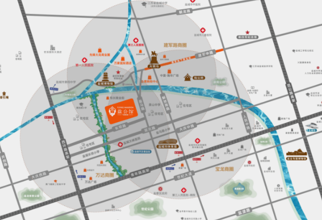 医疗:周边有 18 个一级以上医院,包括盐城市一院、盐城市三院、盐城市中医院等。