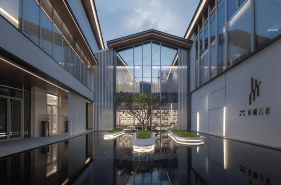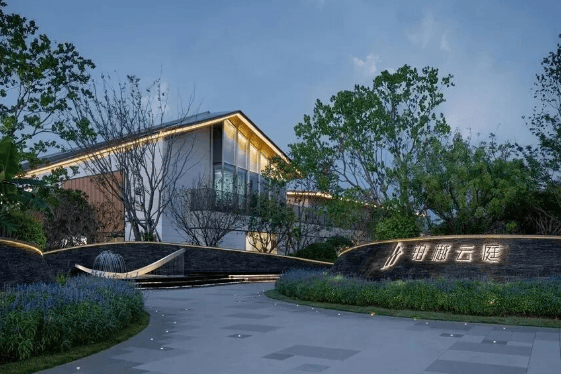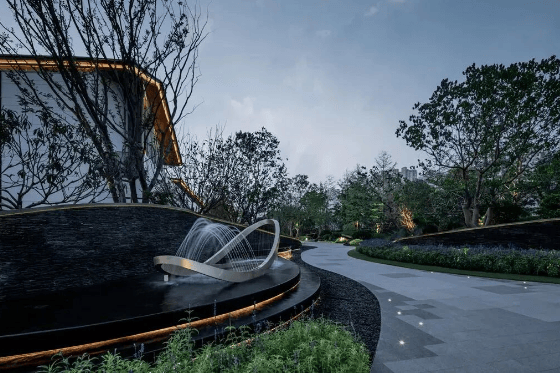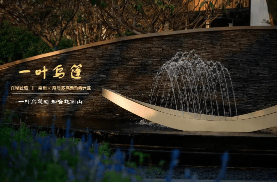 山色从来不世情,水光分与万家清。入口特色跌水景墙, 抽象创意水景雕塑多维形态展现,是静谧的丝带也是开阔水面上一叶乌篷船,迎接着人们入园。 在水景建设初期,项目团队对现场地基进行勘测,发现售楼部周边土方下沉,会引起水景结构不均匀沉降导致很大的漏水风险,他们提前和业主及设计单位建议采用衫木桩打桩,提高地基的压实效果和承载力,最大程度地稳定回填土基层。