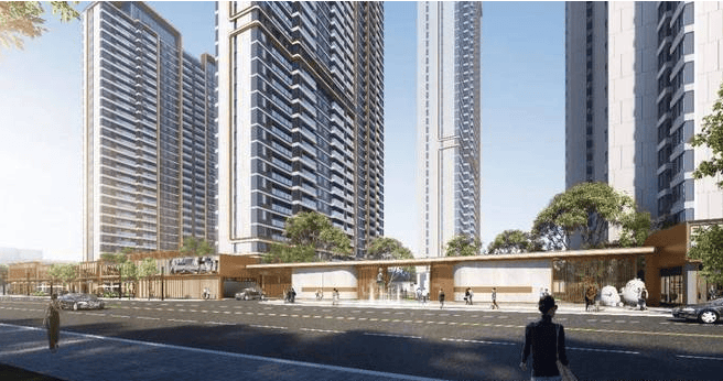 建筑设计:建筑高低起伏构成俊朗天际线,外立面采用类公建化外立面 + 铝板一体板外墙 + 顶端圆角弧线的国际风潮美学。