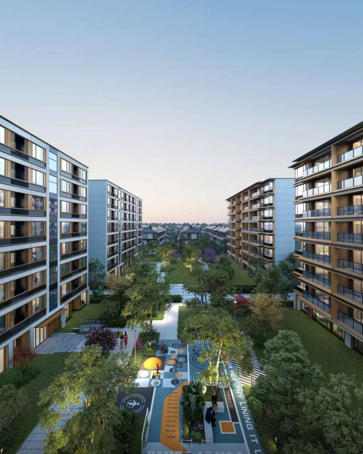 建筑与景观:建筑风格以宋式美学为蓝本,汲取吕府十三厅规制灵感,主立面采用木纹铝板与灰白石材交叠,窗墙比达 0.35,结合垂直绿化系统,能耗较传统建筑降低 40%。园林景观方面,引鉴《园冶》造园精髓,打造 “四时八景” 园林体系,社区绿化率达 38%,400 米夜光慢跑道串联 6 大主题架空层,配备智能雾森系统调节微气候。