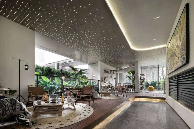 比如,根据功能的不同,配置的灯光也会不同。咖啡屋、健身房、书法区以暖色射灯为主,乒乓球区采用防眩光的线型照明灯,静坐区则加入了造型灯带。