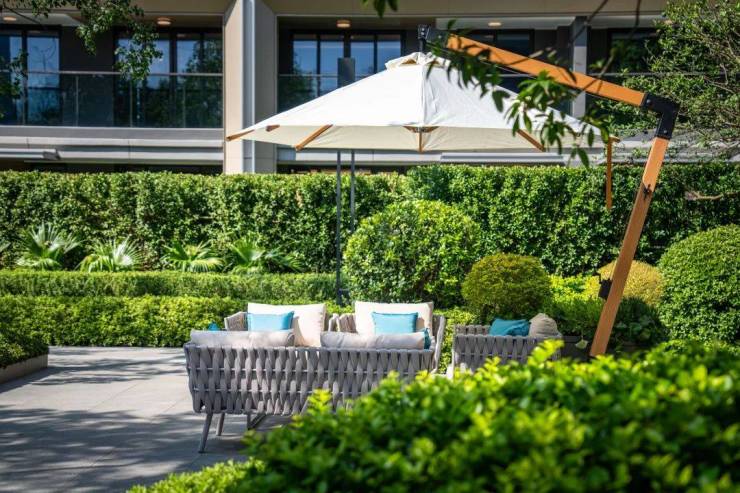 高大的乌桕树下,摆好了休憩座椅;石材景墙前,种上了造型独特的罗汉松,它们组成了润府的“户外会客厅”。
