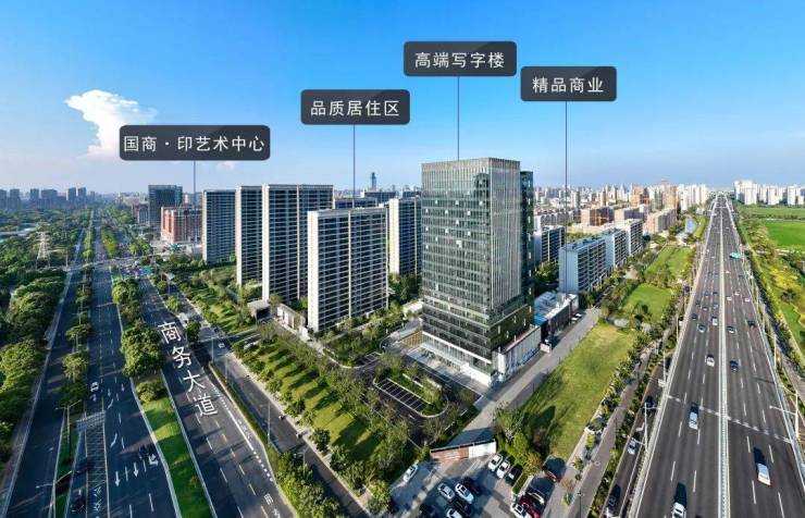 除了崭新的高品质住宅,他还呈现了全玻璃幕墙的高端写字楼,充满高级烟火气的精品商业盒子,以及国商·印艺术中心。