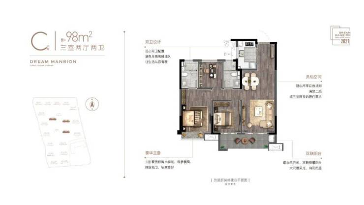 以及89㎡中间套三房,动静分离,三开间朝南,超长景观阳台。