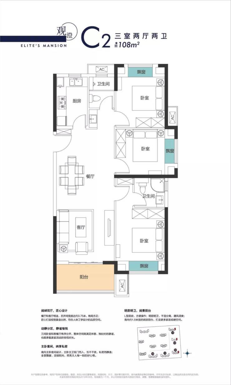 C2户型3室2厅2卫1厨,建面约108平,位于本次加推的5号楼、12号楼的东头位置。