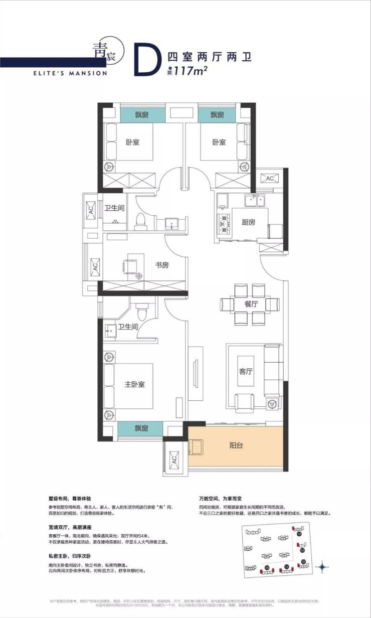 D户型4室2厅2卫1厨,建面约117平,位于本次加推的5号楼、12号楼的西头位置,11号楼的东西两头位置。