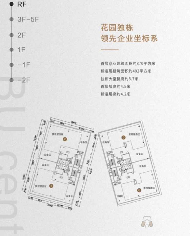 ①花园独栋:2360㎡:赠地下室1400㎡、屋顶花园200㎡、使用面积达4000㎡