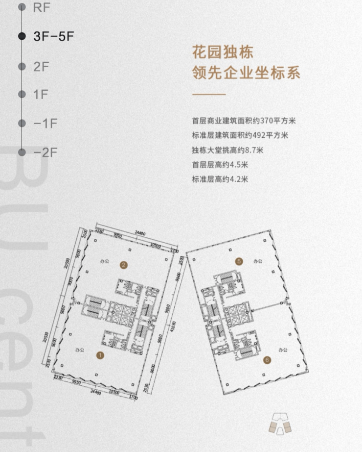 ②时代独栋:3400㎡:赠地下室1800㎡、屋顶花园300㎡、使用面积达5500㎡