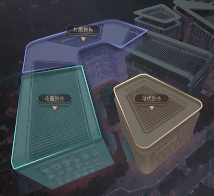 23座独栋办公:位于项目北侧区域,分为三类:时代独栋面积3363㎡,位于项目内侧,是真正意义上的纯独栋、楼王产品。地上5层、地下2层、地下为赠送面积(赠送面积约1629-2358㎡)、共5栋。封面独栋面积4101㎡,位于会鼎路侧,是独栋产品中展示面最好的产品,地上5层、地下2层、地下为赠送面积(赠送面积约1958-2314㎡)、共6栋。花园独栋面积2373㎡,位于封面独栋旁,是项目产品中房型最方正的,因为面积相对较小,因此也是目前最抢手的户型。地上5层、地下2层、地下为赠送面积(赠送面积约1237-1638㎡)、共12栋。