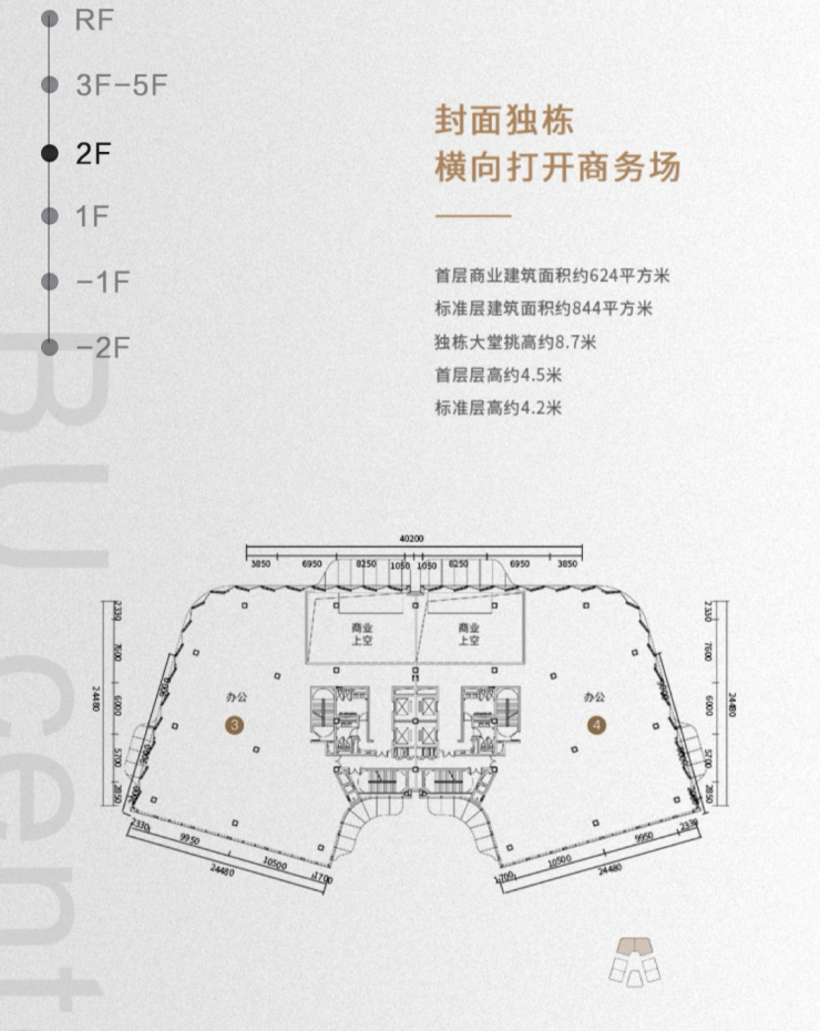 层高:大堂挑高8.7米,地上一层商业性质4.5米,二至五层4.2米