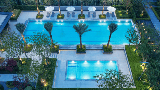 园林景观:以元代画家倪瓒画作为蓝本,打造 “三重归家礼序” 景观,包含叠水景观、星空草坪、樱花步道等八大主题园区,营造出东方风雅的园林氛围。