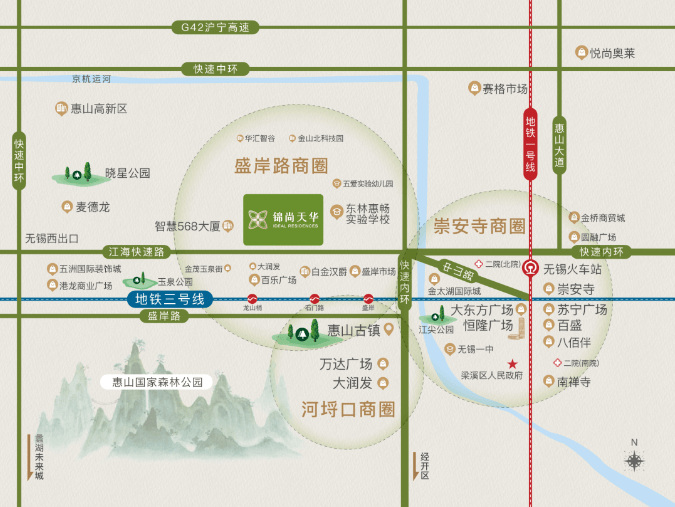 锦尚天华鼎立中山路西,出则繁华,入则静谧,拥享梁溪主城全维丰盛配套,江海西路、惠山隧道、快速内环、中环线(在建中)构筑快速交通路网,畅享一刻中心的高效便捷;中山路、盛岸路、河埒口等核芯商圈环伺,惠山国家森林公园、惠山古镇等丰富文旅资源,繁华都会与自然生态达成平衡,城市新贵的居住梦想在此得以实现,热销自然水到渠成