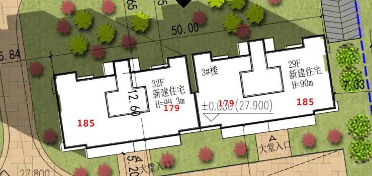 3号楼共2个单元,其中东边单元29层,西边单元32层,均为2梯2户设计,为纯板楼设计,共包含建面约179-185平两个户型。