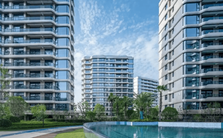 核心指标:总占地约13.28 万㎡,总建面约19.92 万㎡;容积率1.5(镜湖罕见低密),绿化率30%;共 41 栋(7 层洋房 + 13 层小高层),总户数1377 户,车位配比1:1,人车分流;建筑风格为流线型现代风,外立面大面积镜面玻璃 + 金属铝板,景观由美国易顿设计 “七彩凤林” 七重空间。