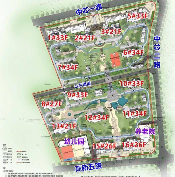 二期共8栋,公共通道南侧的8#27层,9#、10#33层,11#、12#34层、13#21层,15#、16#26层,养老服务用房在11#,物业管理用房在15#,底层架空休闲在16#。13、15#紧邻规划的12班幼儿园。