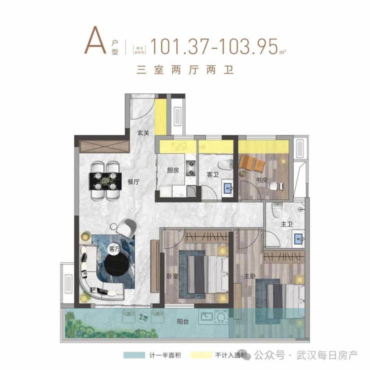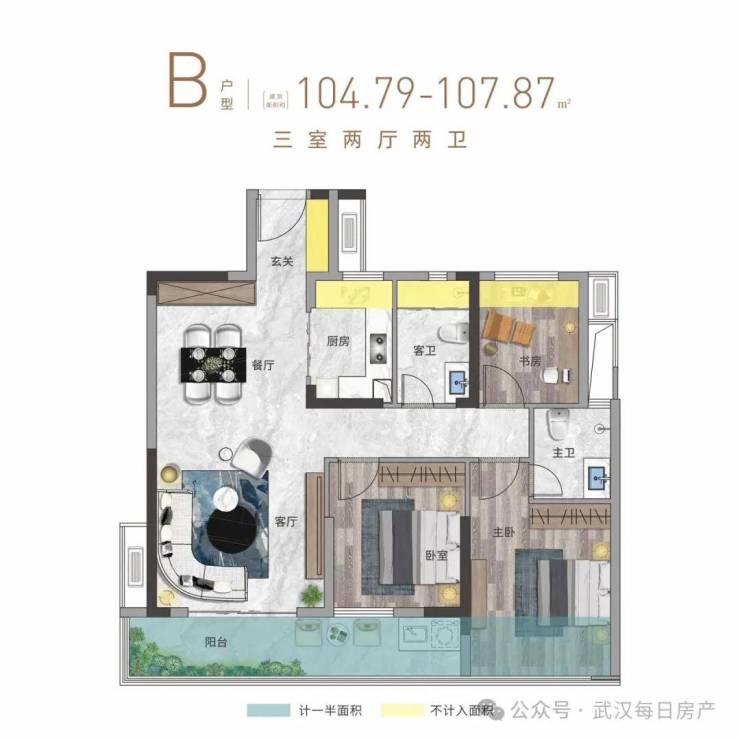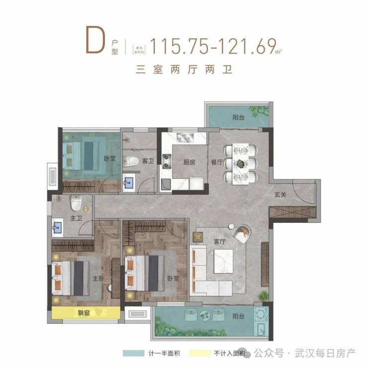 120平内做南北双阳台,独立玄关入户,北向次卧送了不少面积。