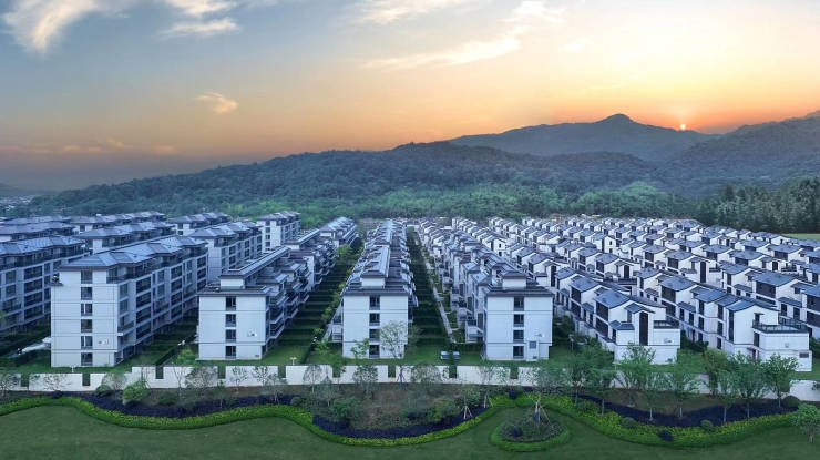 建筑与景观:建筑风格为东方山水逸墅风格,排屋外立面采用大面积石材加金属嵌条,部分真石漆,叠排为真石漆。景观方面,小区东北角配有约 15,000 平方米山体公园,设有农庄、菜园、花圃等,还自带 2500 平方米中央景观花园,配有 600 米健康有氧步道。