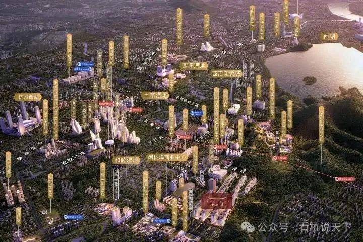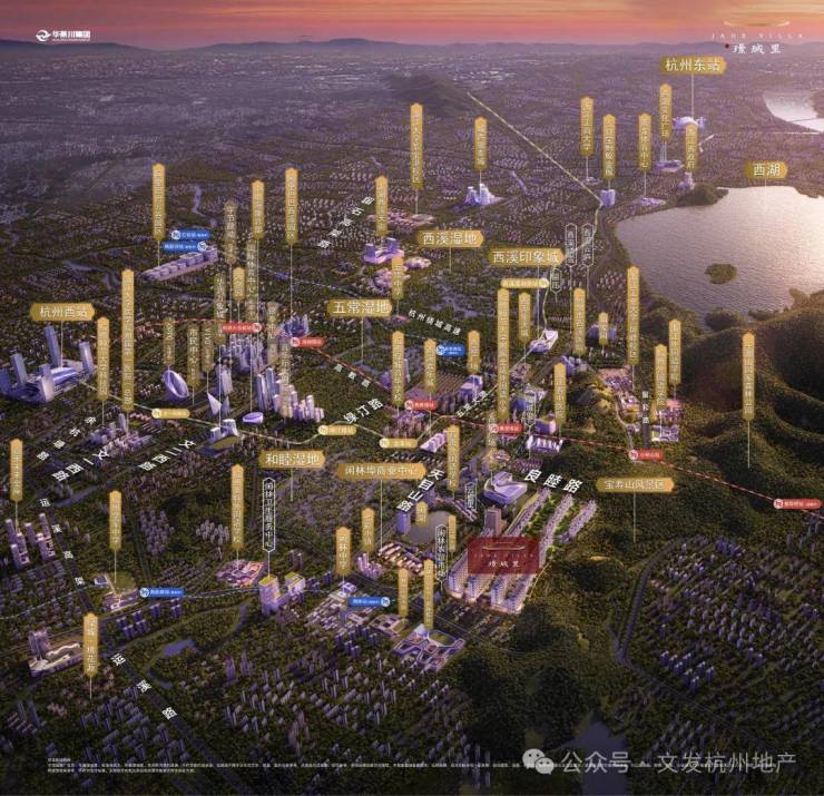 - 背倚西湖群山,对望西溪湿地,6公里直达西溪湿地生态核心,实现“繁华与静谧共生”[[4][7][8]]。
