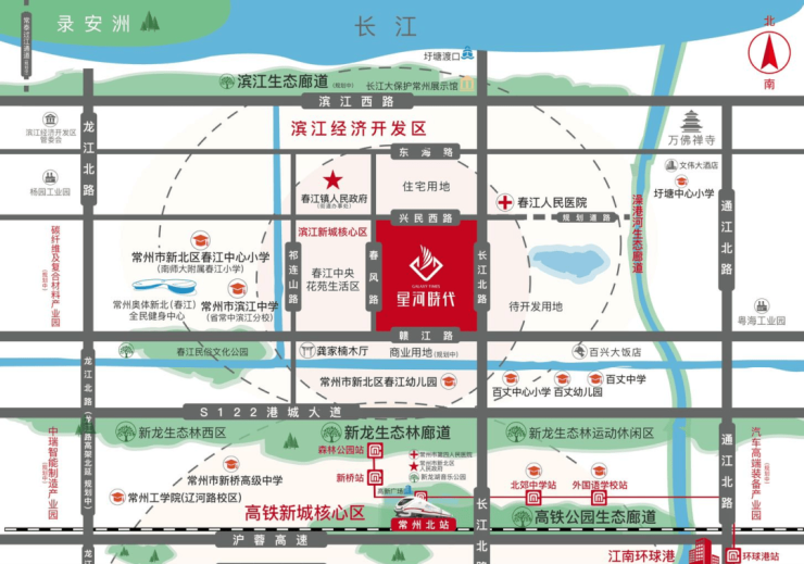 星河时代位处春江中心地段,与春江政府仅一路之隔,同时紧邻长江北路和赣江路,立于高铁新城和滨江新城的发展中轴,以长江路交通大动脉为核心。