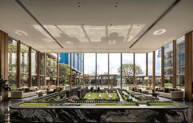 建筑设计:抬高约 2 米打造悬浮式环水岛居,规划 “低密洋房 + 当代逸墅” 纯粹住区。洋房采用 “超流体” 美学立面,阳台进深最大 2.8 米,270° 广角观景视野,私密性高;当代逸墅配备独立入户门厅及最大约 400 平方米私家花园。