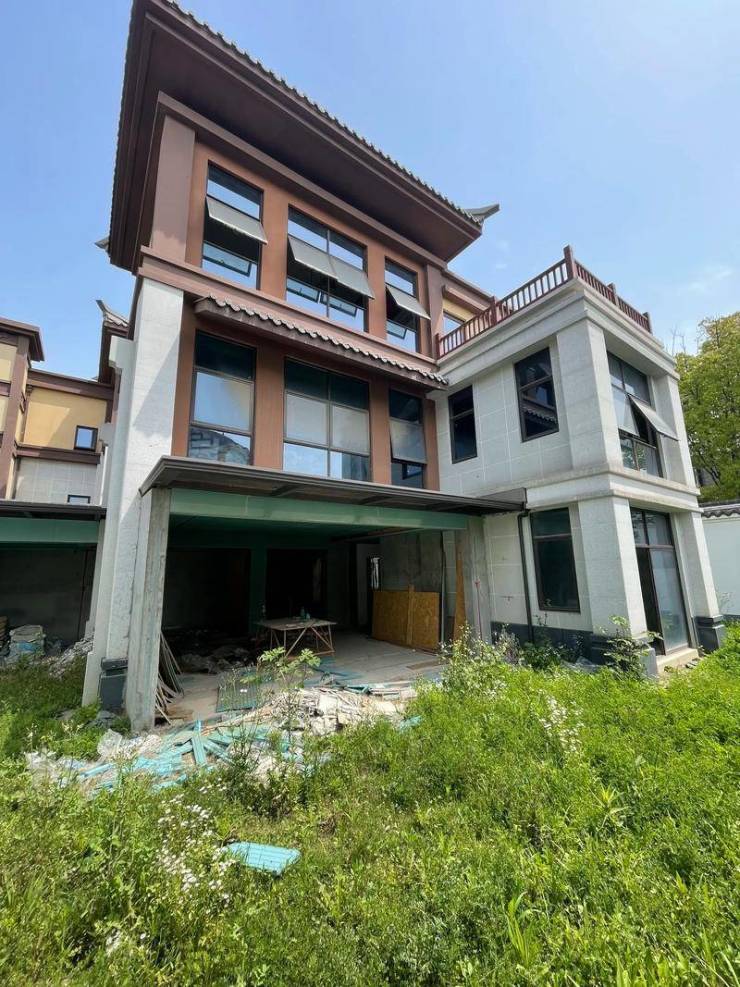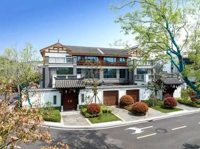 建筑风格:现代中式为主,融合荆楚、江南、川派、岭南官式、民国等六大风格,3 米实体高墙围合私院,入户铜门 + 金丝柚木院门,仪式感强