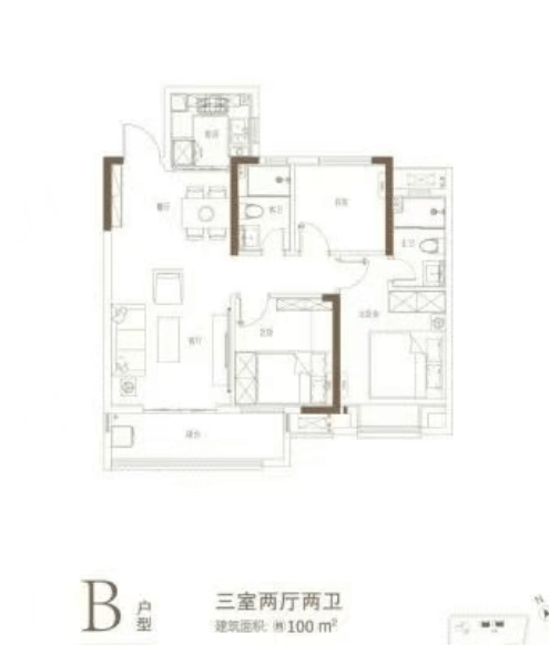 户型介绍:户型有建面约 95-154㎡的 3-4 房,以 12 栋 B 户型 3 室 2 厅 2 卫 100 平为例,户型方正,南北通透,客厅、餐厅、主卧、次卧朝南,采光通风好,且动静分离,居住体验佳。