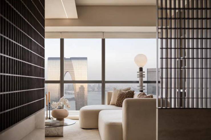 开放的客餐厅空间独揽窗外风光,利用优质的景观资源形成开阔的视野空间。空间中大量采用温润柔和的材质,以材质传达情绪,这种平易哑喑的肌理让人感到愉静沉淀、精神安然,在无形中感受被沉淀下来的生活气息。