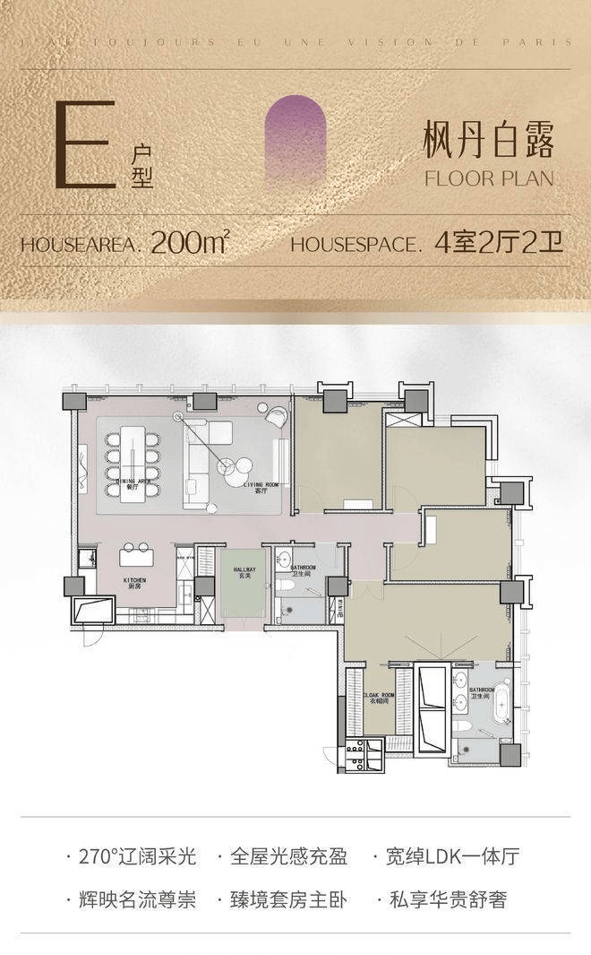 200㎡:4 房 2 厅 2 卫,枫丹白露主题,户型方正,尺度阔绰,尽显尊贵与奢华。
