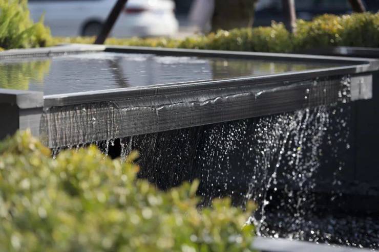 入口两侧采用镜面跌水式水景与中式鱼鳞水景将有限延伸为无限,流水潺潺,熠熠水光,镜面水景的 光影效果配合凹凸线条的层次变化, 错落的花镜倒映在水面上,营造大气开阔的氛围。