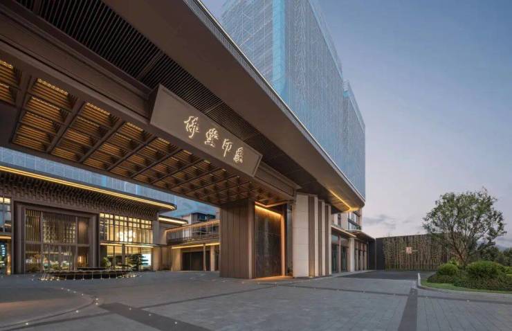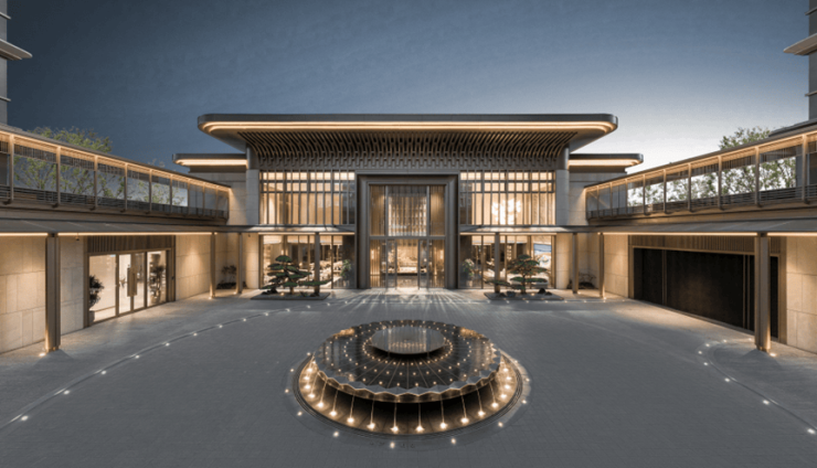 由天然矿脉原石葡萄牙米黄匠造的山屏府门迎宾而入,约40米跨度,8.2米挑高的恢弘尺度气派轩昂,尽显高门大户的奢贵。穿门而行,进入遇莲归堂,约600㎡酒店式落客区大气开阔,宝相莲花水景汲韵佛堂佛缘文化,给业主以强大的精神感染力与归家场域感。两棵半世纪树龄的罗汉松阵列相迎,更凸显归家的仪式感和尊贵感。