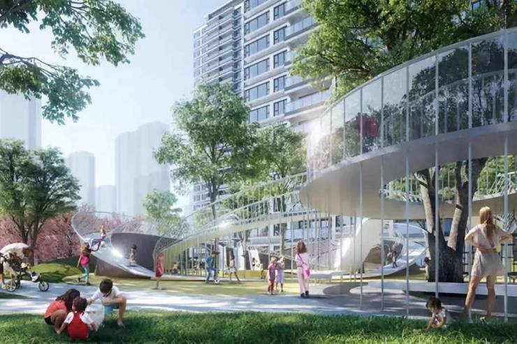 约1000㎡的童趣天地,滑滑梯、攀岩墙、秋千、蹦床、树屋……同时拥有家长休息区、林端漫步乐园等,为业主提供了休憩之所;