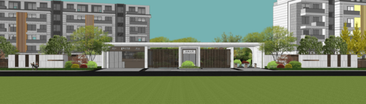 大门,是社区的面子,甚至可以定义一座社区的价值。凤屿山河南门面宽约30米,本就气派。为强化这种气场,项目在东西两侧设计宽约15米的对称景墙,共约60米宽的社区主入口,尺度之阔绰,在蠡湖湾难觅其二,强烈的归家礼仪氛围,给业主带来满格的尊崇感。