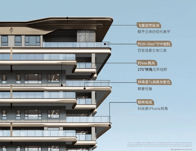 建筑外观:外立面采用深灰色铝板、银灰色一体板、LOW-E 玻璃、米白色一体板,窗墙比大,屋顶呈飞翼造型,转角有着如同 iPhone 般的精密弧度。