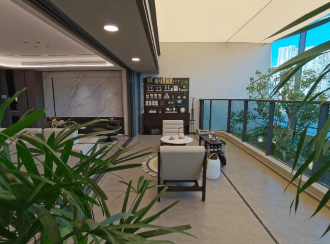 建面约 185㎡:四房两厅三卫,270° 转角露台,主卧独立卫浴 + 双台盆,空中庭院面积达 62㎡。