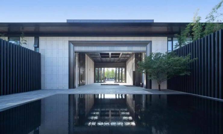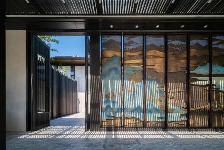 如院入境“府院”,远观延伸的屋面承古韵国风,给人以传统府院高门望府之感,现代技术使深远的挑檐较之古建筑更为纤薄轻巧。在融入山水诗情画意的基础上,奠定了如院的基调。