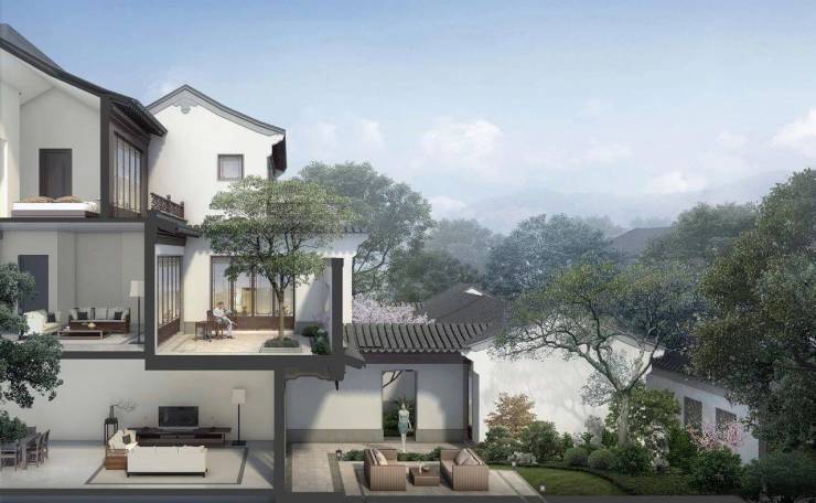 压轴房源户型多为大开间、短进深的布局,堪称中式合院的黄金面宽比,不仅有别于传统的中式建筑,更有利于通风、防潮、采光等实用功能,更能将风光无界融于室内,未来,只要在自家,透过取景框一样的窗户,利用一定的坡地高差,就能看到远山如黛,近枝疏影。