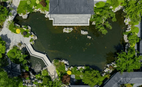 庭院设计:南北双庭院设计,最小庭院面积65㎡,最大达389㎡,围墙高3.3米保障私密性,前院以松木叠水、亭台点缀,后院可莳花凿池,满足江南文人雅趣。