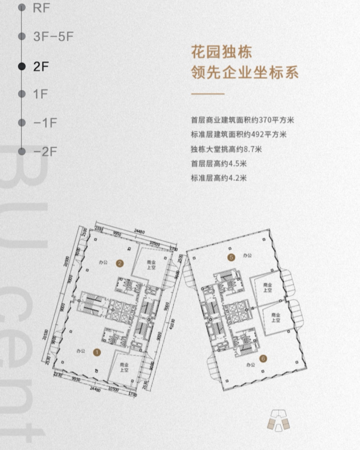 层高:大堂挑高8.7米,地上一层商业性质4.5米,二至五层4.2米