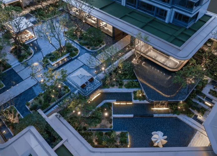 西湖区之江低密纯改善社区,3.2 米全抬地台地设计,“园林→架空层→住宅” 立体洄游动线,私密性强。
