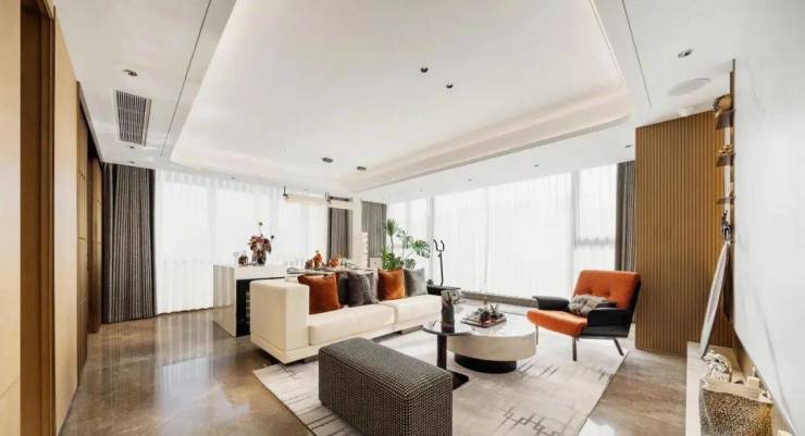 上叠约6.75米的景观宽厅,将厨房、餐厅、客厅、阳台连成流畅的整体,视觉上延展空间感的同时,更能拓展出丰富的生活场景,比如书房、茶室、吧台、运动区……